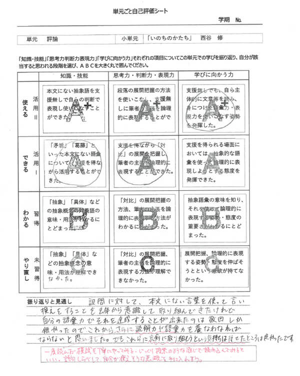 これは、3年生の国語(現代文)で、評論文を読み解く単元を学習した後に生徒が記入した振り返りシートです。