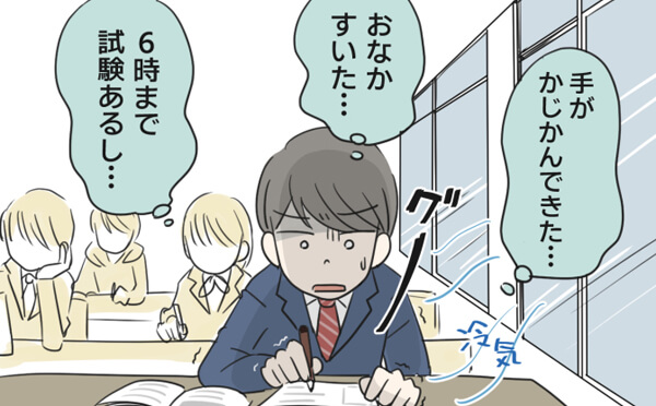 当時はコロナ禍で、廊下への出入り口は開けっ放し、定期的に換気されていて部屋はとても寒かったそう。ただでさえ試験は真冬で寒さとの戦いなのに、ここでも体力が削がれます。さらに毎年のように報道される天候の交通機関への影響。自分が学生のころから思っていますが……なんでこんなに寒い時期に入試があるんでしょう……。