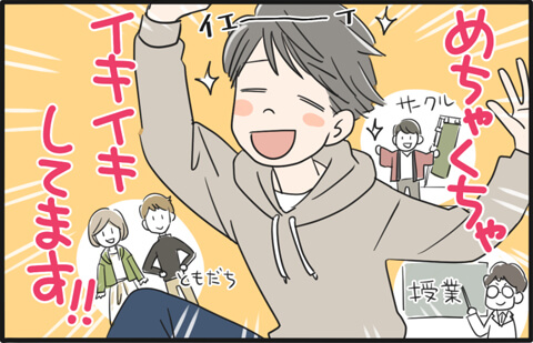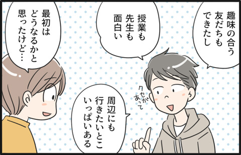 コロナの影響で入学後すぐに休校になってしまいましたが、それまでの2週間で2つのサークルに入り、学部内でも友達を作り、休校中も連絡、活動していました。秋から少しずつ対面授業になると、文化祭などの大学のイベントにも積極的に参加して気付けば学内が友達だらけになっているそうです。君、そんなにコミュ力あったっけ……? と母もびっくりです。