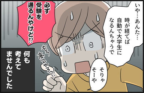 マンガの中の「時がたてば自動で大学生になるんとちゃうで!」は実際に私が何度も言ったセリフです。長男は中高一貫校に通っていたため、高校受験がありませんでした。もちろん、同級生には中学生時代からきちんと大学進学を見据えて、計画的に動いている友人もいました。しかし我が子に関して言えば、高校受験を経験していない分どうしても幼く、《なんとかなるだろう》精神が、悪い意味で発揮されているのではないかとヒヤヒヤする日々……。「なんとかなるんじゃなくて、なんとかするんや!」……これも、何度も言いましたね。