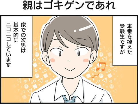 当時、長男の先生が「受験生の親は何もできませんから、機嫌よく過ごしてください!」と話していました。次男が受験生の今はその教えを守り、いつも上機嫌な家族と、本当に受験生なの? というくらい笑顔の次男。
