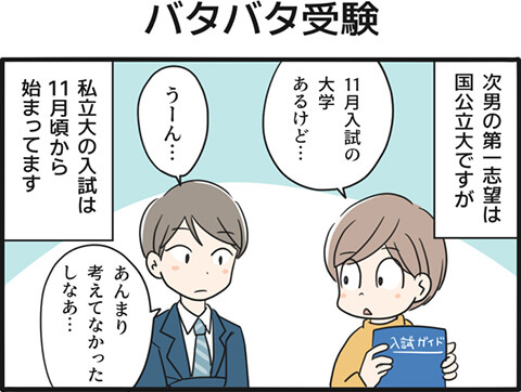 我が家は併願校を考えるのが遅く、秋に入ってから候補の大学を絞っていったのですが、中には11月に入試のある大学もありました。しかし、大学別の対策をするにはあまりにも準備期間がない。オープンキャンパスにも行けておらず、大学の情報も足りない。何より次男がその大学に進む気があるのかが、一番の問題でした。
