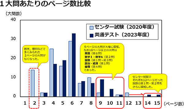 実際にセンター試験最終年度の問題と、共通テスト3年目の問題で、1大問あたりのページ数を比較したところ、全体的に増加傾向がみられました。