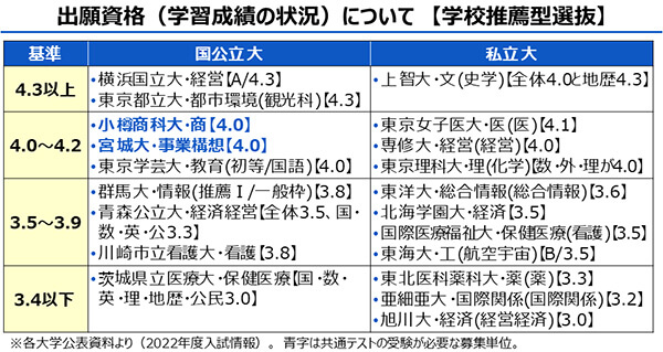 「学校推薦型選抜」「総合型選抜」いずれも、大学・学部学科によって成績基準や選考方法も異なります。