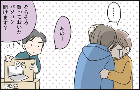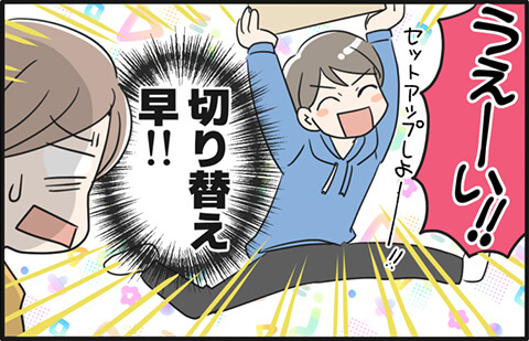 今これを開ける時では? そうだ!! 開封式しよう!! と、信じられないスピードで切り替えて、キャッキャとセットアップに走っていきました。このマンガは大げさではなく、ほんとに3分くらいしか落ち込んでいないのでは? という状況です。