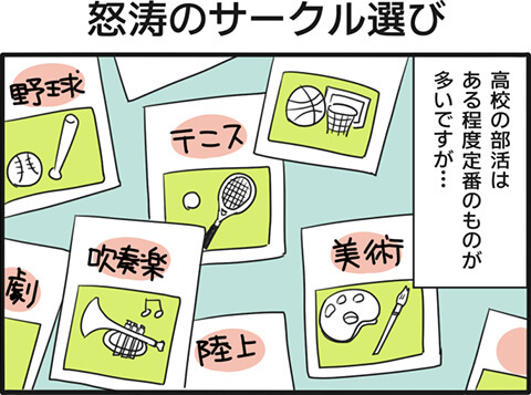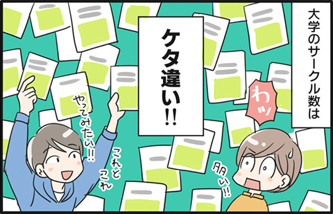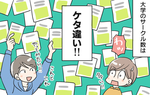 高校と違って大学はスケールが大きい! と感じることは多々ありますが、サークルもその1つ。高校のように定番の部活だけではなく、同じ競技でサークルがいくつもあったり、たとえば絵を描くサークルにしてもイラスト、美術、漫画もろもろとどんどん派生していったり、とにかく細分化されています。