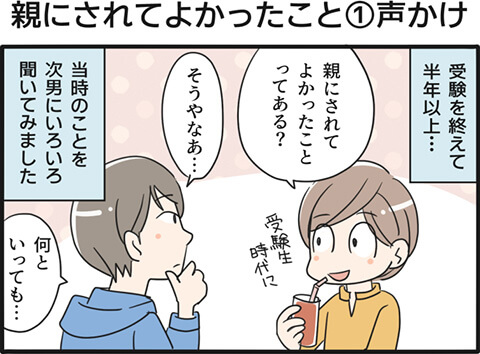 受験生時代を思い出しながら、今だから言えるあの時こうだった! を次男に聞いてみました。まずは「親にされてよかったこと」