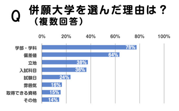 1位は「学部・学科」で、やはり「併願大でも興味ある学問を学べるか」を受験の決め手と考えた人が多いようです。