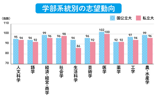 特に、薬学や生活科学などの学部系統では志望者減少が目立ちます。