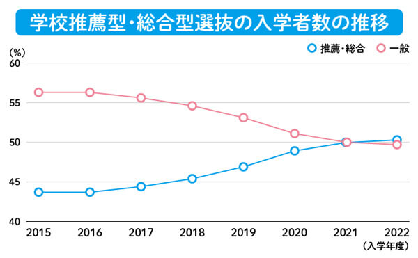 2022年度には「推薦入試による入学者数」は50.3%となり、「一般選抜による入学者数」を上回りました。