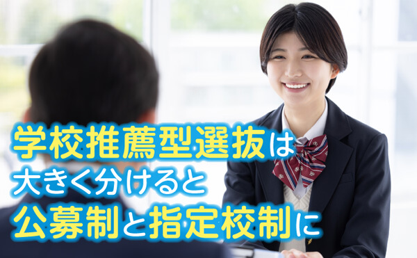 学校推薦型選抜は、「公募制」と「指定校制」の2種類に大きく分けられます。