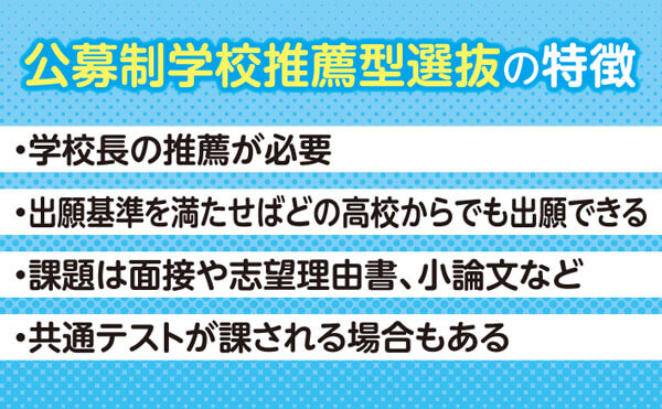 学校推薦型選抜の「公募制」推薦入試は、大学が指定する基準(学校の成績など)をクリアし、学校長の推薦がもらえれば、どの高校からでも出願できます。