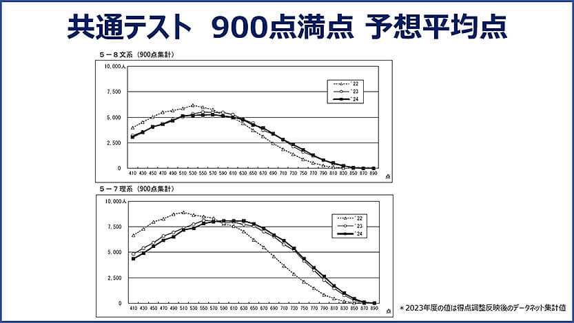 5教科900点集計の予想平均点は文系が536点(得点率約60%)、理系が559点(得点率約62%)となりました。