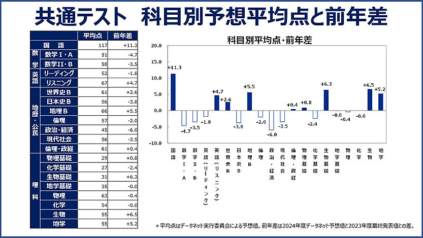 得点ベースでは、政治経済45点、数学I・A51点、英語リーディング52点などで予想平均点が下がり、逆に、国語は117点と前年からも+11点、英語リスニング67点、地理B66点と予想平均点がアップする結果に。