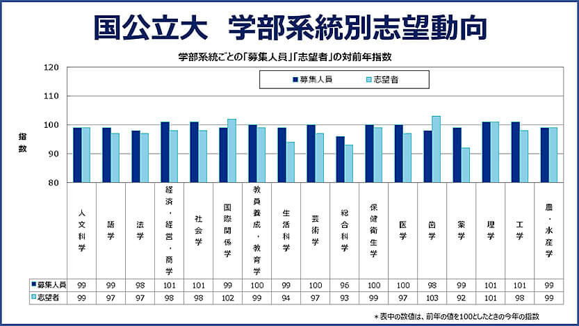 2024年度の国公立大全体の志望者数は前年比98%で、前年並みを維持しています。