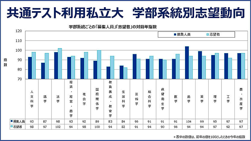 共通テスト利用私立大全体の志望者数は前年比95%とやや減少しています。