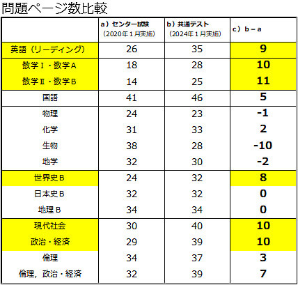 次の表はセンター試験の最終年度と今年の共通テストの問題ページ数を比較したものですが、英語、数学、現代社会などで10ページ程度増加しています。