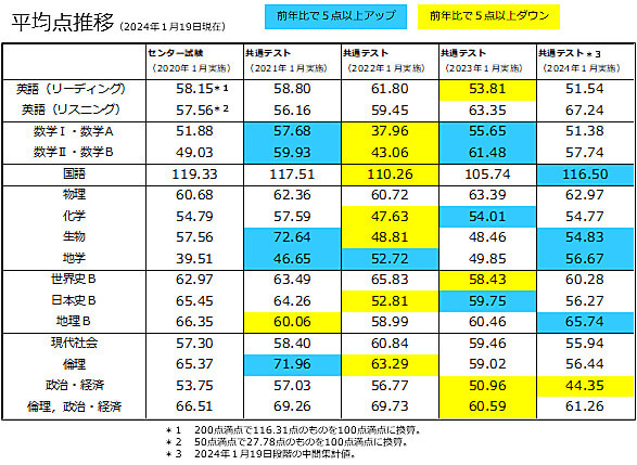 前年比で5点以上の変動があったところを色分けしていますが、共通テスト1年目は平均点が5点以上高くなった科目が多めで、共通テスト2年目では多くの科目で平均点ダウンなどの変動はみられますが、正答率はセンター試験と同様におよそ6割となっています。