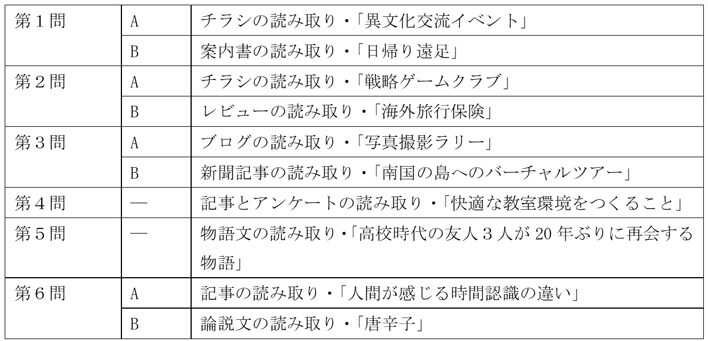 リーディングの各大問では、以下のような媒体・題材の読み取りが出題されました。