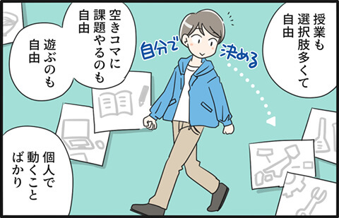 意外な所では「空きコマ」のをいろいろなことに使えるのが便利で、1日みっちり授業のある高校との違いを実感しているとのこと。