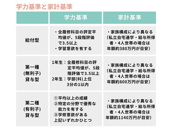 学力基準と家計基準は、奨学金の種類によって以下のように異なります。