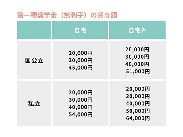 第一種(無利子の奨学金)は「自宅通学か、自宅外通学か?」「大学は国公立・私立のどちらか?」で、貸与金額の設定が異なります。