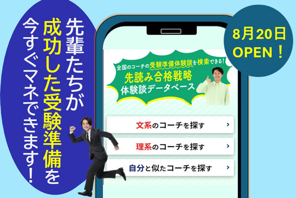 お子さまに合った具体的な受験準備法は、志望大合格コーチの『先読み合格戦略』体験談データベースで見つけられます。