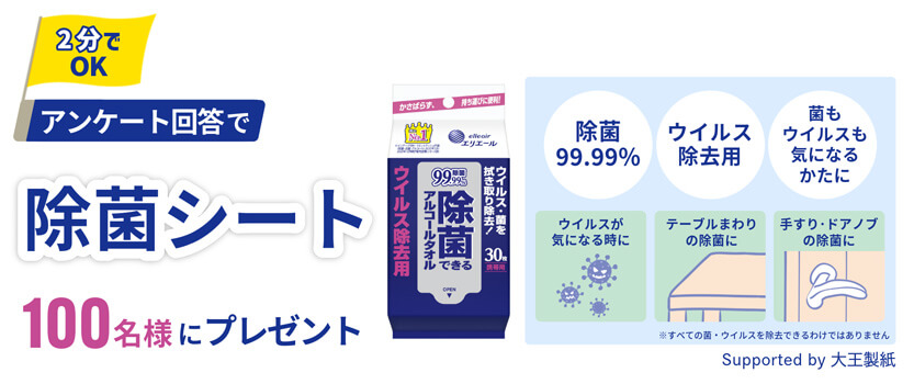 お子さまが受験やテストで100%の実力を発揮できるように、ささやかではありますが、アンケートに答えてくださったかたの中から抽選で100名様に、「エリエール 除菌できるアルコールタオル ウイルス除去用 携帯用30枚」をプレゼントします。習慣づくりの第一歩として、ぜひご応募ください。