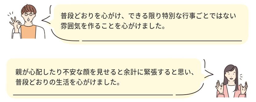 「サポートしなきゃ」と腫れ物に触るように扱うのは逆効果になることも。「家は心が休まる場所でもある」と考えて、普段どおり接することで、お子さまもリラックスしやすくなるのかもしれません。