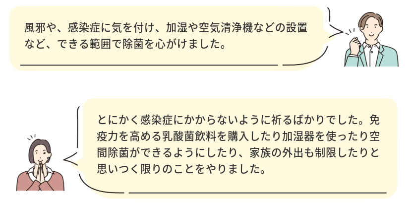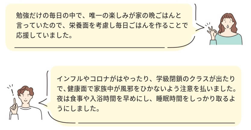受験シーズン本番は、感染症が流行したり、不安を抱えたりしやすく、コンディションも乱れがち。先輩保護者の声からは、さりげなく、でも細やかなサポートをした様子が見られます。