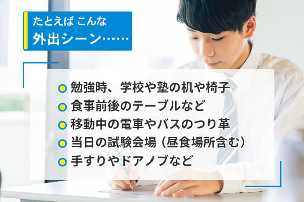 受験本番に緊張した時にも、いつも繰り返してきた拭き取り除菌をすることで、平常心を取り戻しやすくなります。