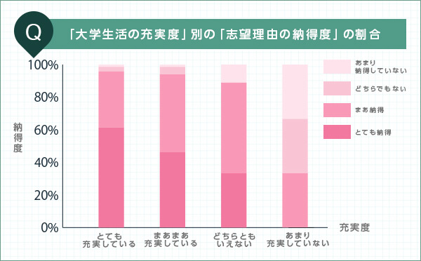 ——進研ゼミ受講経験のある大学生に回答してもらったアンケートの結果からは、「志望理由の納得度」と「大学生活の充実度」には強い相関関係があることが明らかになりました。