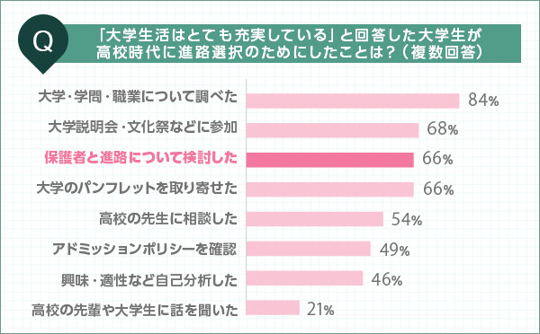 この結果からも、納得して進路選択を行った人は、保護者のかたから上手にサポートしてもらいながら検討を進めたのではないかと推測できます。