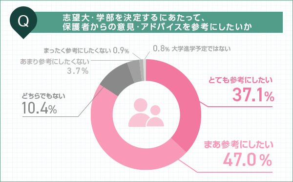高校生に「志望大・学部を決定するにあたって、保護者からの意見・アドバイスを参考にしたいですか?」と質問したところ、「とても参考にしたい」と回答した人が37.1%、「まあ参考にしたい」が47.0%みられました。