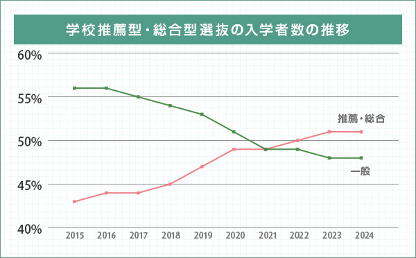 また、いわゆる推薦入試と総称される「学校推薦型選抜」や「総合型選抜」による入学者も近年増加傾向にあります。