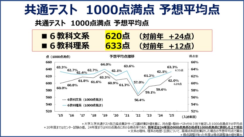 予想平均点は6教科文系が620点(得点率約62.0%)で前年+2.4%、6教科理系が633点(得点率約63.3%)で前年+1.2%と、文系理系ともに得点率比較でアップしました。