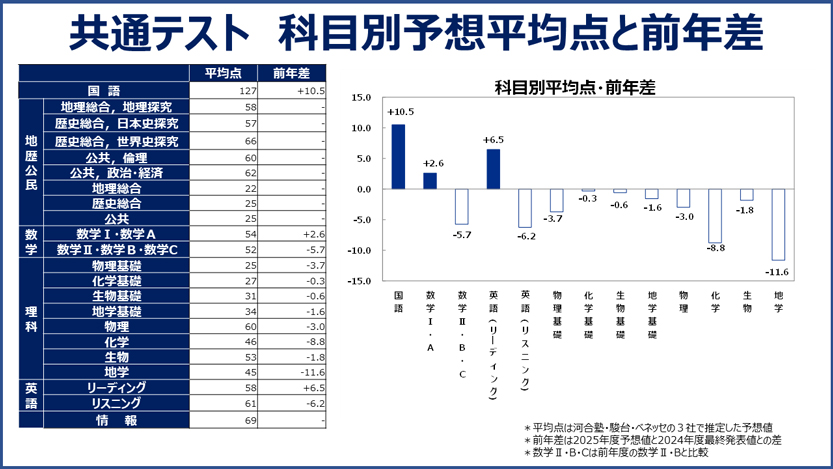 科目別では、前年得点が低かった数学ⅠAの予想平均点は+3点の54点、英語リーディングは+6点の58点と伸びました。