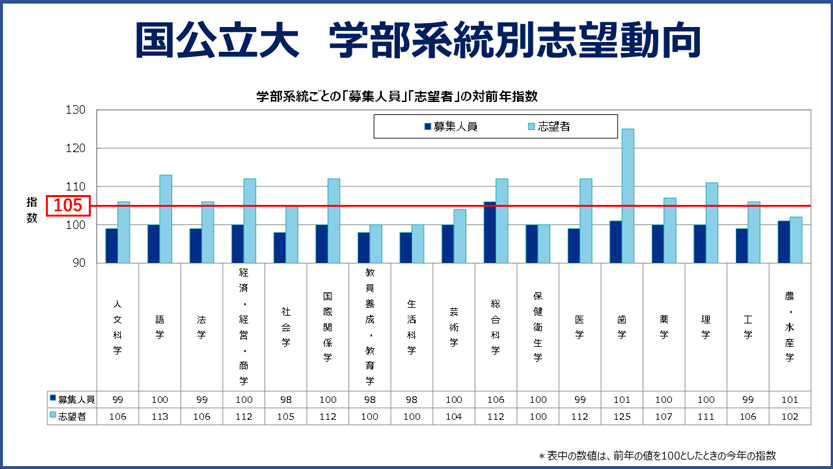 *志望動向の対前年指数は大学入学共通テスト自己採点集計サービスの集計件数の増加などに伴い「105」をおおむね前年並みの基準として増減を表現しています。