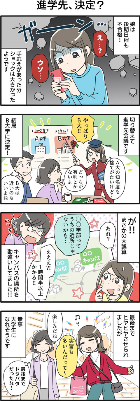 最終的な進学先は、共通テスト利用で合格していた2校のうち、やりたいことを学べるB大学を選択。「A大のほうが知名度は高いよね……」と最後の最後に迷いを見せた娘に、「どっちが有利なんてこと、社会に出たら関係ないよ」とアドバイスしました。マイペースだけど、自分の興味には驚くほどまっすぐな娘。受験をとおしてその姿を見てきたからこそ、「学びたいこと」を最優先にしてほしいと強く思いました。