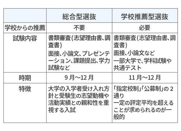 実施時期も総合型選抜は9月から12月、学校推薦型選抜は11月から12月です。