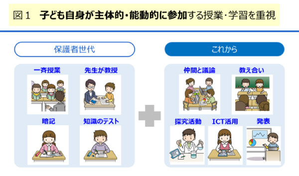 お子様の学校の授業参観などを通して、学校の授業がどのように変化しているのかを実感していただけるとよいと思います。保護者のみなさんが経験した授業とはずいぶん変化していることが感じられる機会となると思います。また、お住まいの地域や学校によって、一律に変化するわけではありません。しかし、学びがどう変わっていくかを知っておくことで、授業の見方やお子様との接し方も変わってくるのではないかと思います。