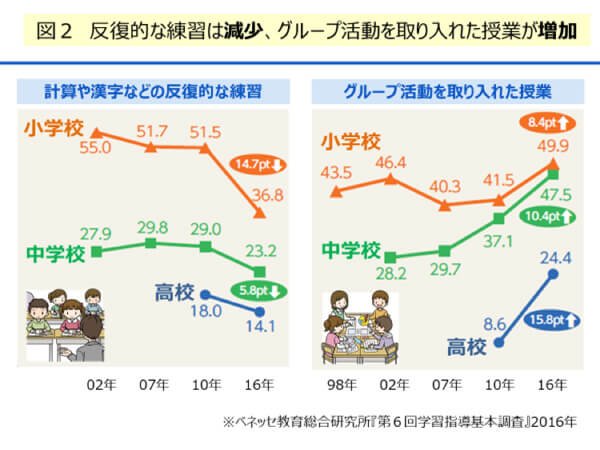 すでに今の小学校ではそうした授業が行われ始めており、先生が子どもたちに知識を伝達する「一斉型の授業」スタイルから、子どもが主体となって活動するような授業が増えています(図1,2)。