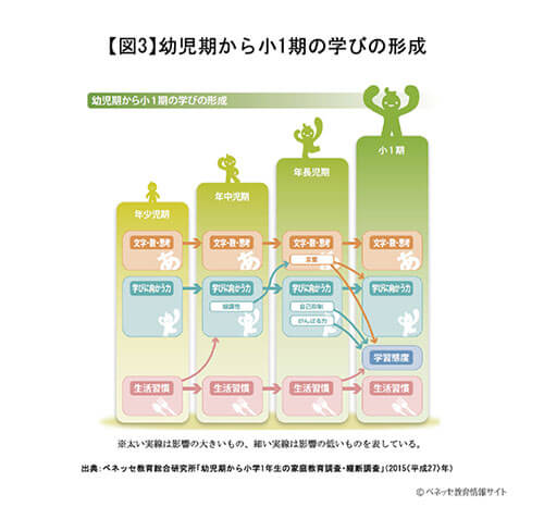 幼稚園や保育園から小1の接続期は、幼児期から児童期に入り、学習生活が始まる重要な時期です。なかでも、年長児期に《生活習慣》や《学びに向かう力》の『がんばる力』、《文字・数・思考》の『言葉』が身についている子どもほど、小1で「自ら進んで学ぶ」傾向にあることがわかりました。年長児期において、保護者が子どもの意欲や自分で考える行動を支えることが、子ども自身が育つ力を支えるのに重要であることもわかりました。