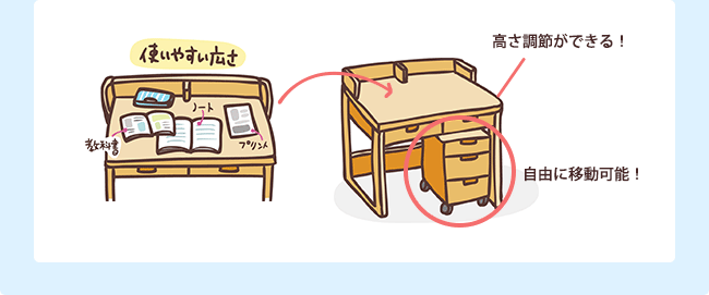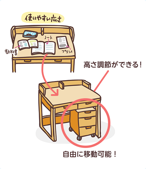 まずは十分な作業スペースの確保を優先。本棚や引き出しなどのパーツは、移動できるとレイアウト変更しやすく成長や利き手にも合わせやすい。いすだけでなく机も高さ調整が可能だと、より体に合わせやすい。