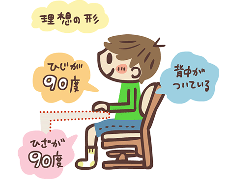 - いすに深く座り、足の裏が床について、ひざが直角に曲がる高さにする。