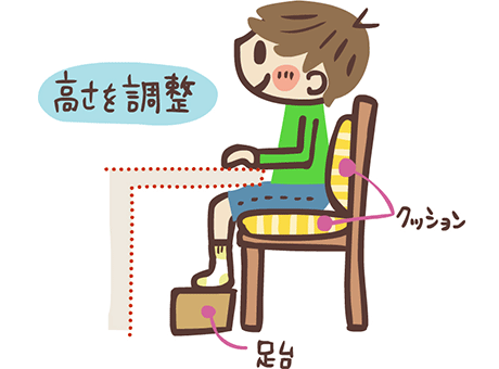 - いすにクッションを置いて机に手を置いてひじが直角になる高さにする。