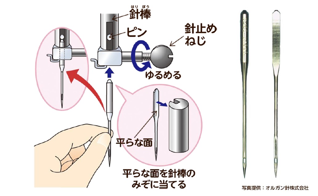 1.ミシン針には平らな面があります。この面をミシンの奥側へ向けます(※機種によって面を向ける方向が異なるのでご注意ください)。
