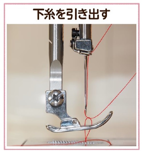 2.はずみ車を回し続けて針を上げると、上糸に下糸が絡んで出てきます。