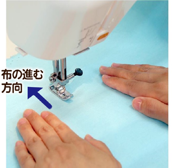 2.左手で布の奥側をつまみ、縫い進みます。両手を添えることで、縫い目の曲がりや縫いずれを防げます。