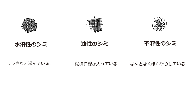 シミには、大きく分けて「水溶性のシミ」「油性のシミ」「不溶性のシミ」という3つの種類があります。見た目で区別する場合、水溶性のシミは、くっきりと滲(にじ)んでいるもの。油性のシミは、縦横に線が入っているもの。そして不溶性のシミは、輪郭がぼんやりしているものです。原因不明のシミは、光にすかして形を確認し、どのタイプか見分けるといいでしょう。